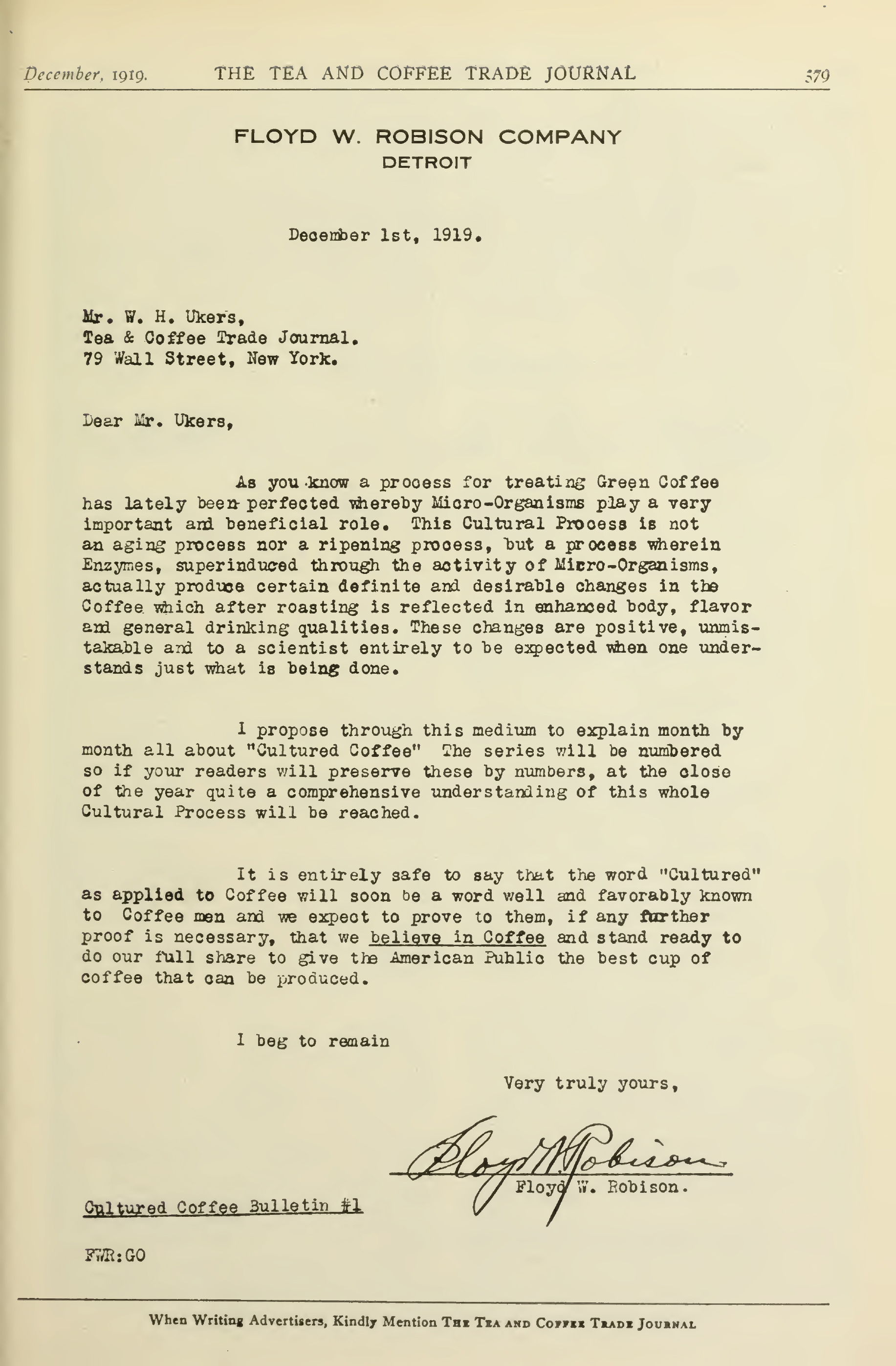 Những lời khích lệ ấy đã thúc đẩy Robison đưa sản phẩm ra thị trường cà phê nhân xanh bằng một phương thức khác thường: không quảng cáo thương mại truyền thống, mà giải thích cơ sở khoa học đứng sau quy trình. Ông thực hiện điều này trong một loạt quảng cáo – hiện vẫn được lưu lại trong các tài liệu đi kèm. Cách tiếp cận độc đáo này nhiều khả năng đã thu hút sự chú ý của độc giả, mở rộng kiến thức và tạo dựng niềm tin cộng đồng vào một công nghệ vẫn còn rất mới mẻ thời bấy giờ. Nó cũng cho thấy rằng, ngay theo chuẩn mực hiện đại, Robison đã hiểu rõ các nguyên lý cốt lõi và áp dụng chúng một cách có chủ đích.